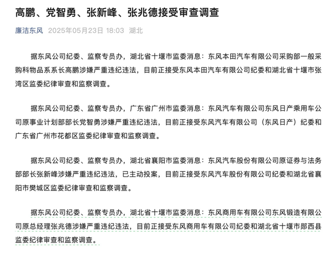 此次,东风本田、东风日产、东风商用车等合资子公司的高鹏、党智勇、张新峰、张兆德4人落马,涵盖采购、计划、证券法务等关键岗位。