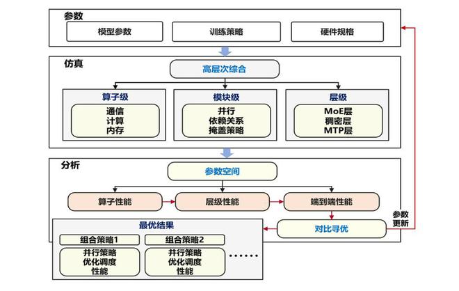 华为团队采用如下图所示的系统建模仿真框架,将原本需要大量人工试错的并行策略选择问题转化为精确的自动化搜索过程。