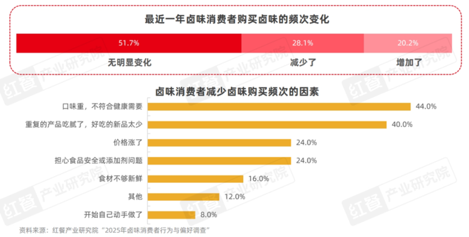 红餐产业研究院“2025年卤味消费者行为与偏好调查”显示,在最近一年里,51.7%的受访者购买卤味的频次未出现明显变化,购买频次增加的消费者比例与购买频次减少的消费者比例相近,这表明卤味的消费群体比较稳定。
