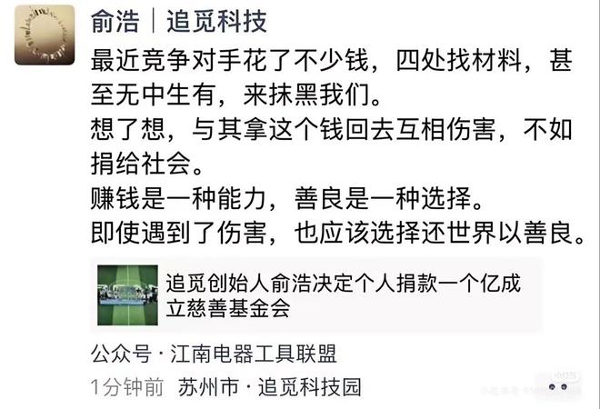 近日,追觅创始人俞浩在朋友圈发文称,竞争对手花了不少钱抹黑追觅。俞浩决定将这些用于抹黑的钱捐给社会,宣布个人捐款 1 亿... 近日,追觅创始人俞浩在朋友圈发文称,竞争对手花了不少钱抹黑追觅。