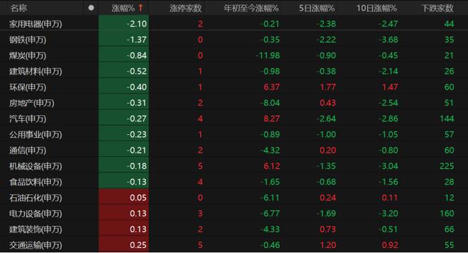 家用电器板块跌幅超过2%,钢铁、煤炭、建筑材料、环保、房地产等板块均收跌。