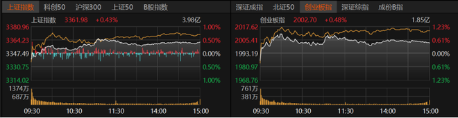 6月3日,A股震荡走强,指数、板块、个股收红居多。沪指收涨0.43%报3361.98点,创业板指收涨0.48%报2002.7点。科创50、上证50、沪深300微涨,北证50涨逾1%。