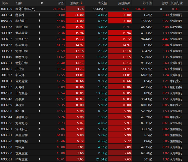 医药生物板块收涨1.78%,年内涨幅扩至8.51%。今日14只相关个股涨停,舒泰神、华纳药厂20CM涨停。