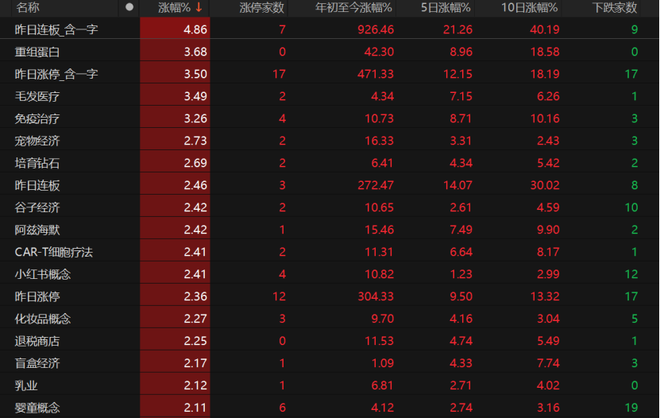 重组蛋白概念继续走高,今日大涨3.68%,年内涨幅扩至42.3%。毛发医疗、免疫治疗、阿兹海默等医药股表现不错,化妆品概念、退税商店、乳业等概念也表现不错。