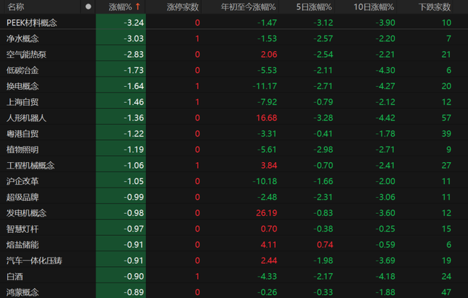 PEEK材料概念跌逾3%,换电概念、人形机器人跌幅均超过1%。
