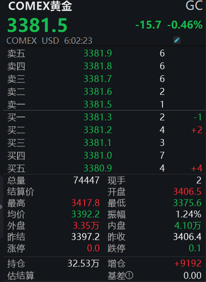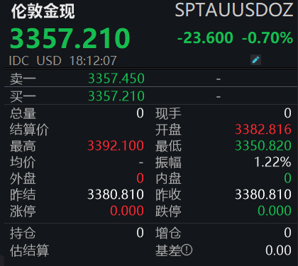 截至记者发稿,伦敦金现价格由盘中最高的3392.1美元/盎司下跌至3357.21美元/盎司,COMEX黄金期货价格则由盘中最高的3417.8美元/盎司下跌至3381.5美元/盎司。