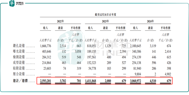 踩上AI及新能源汽车两大风口的大族数控,在2024年的产品总销量实现快速增长,达4510套,较2023年同期的2080套增长约117%。同时,其产品平均售价保持稳定,2024年为67.9万元(单位人民币,下同)/套,与2023年同期持平。