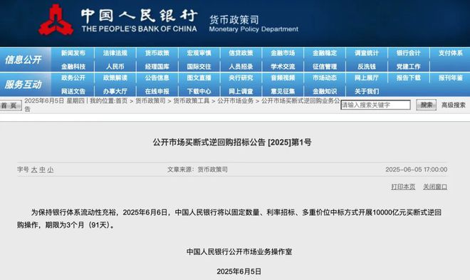 今日,央行发布公告,“为保持银行体系流动性充裕,2025年6月6日,中国人民银行将以固定数量、利率招标、多重价位中标方式开展10000亿元买断式逆回购操作,期限为3个月(91天)”。