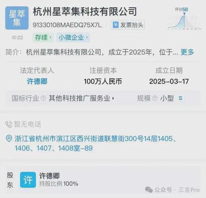 天眼查显示,杭州星萃集科技有限公司成立于今年的3月17日,注册资金100万元,法定代表人为许德卿。