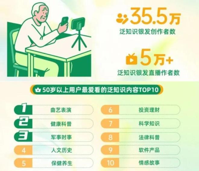 快手的老年用户群"知识味"浓郁,平台近年发力泛知识内容取得一定效果。官方数据显示,快手站内50岁以上泛知识银发创作者数量达35.5万+、直播作者数量5万+、"小满人群"日活渗透率近30%,简直是智能教育硬件、线上课程、老年教育机构的天然流量池。