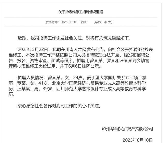 6月10日,泸州燃气公司发布通报,对拟聘人员情况作出说明:曾某某,女,24岁,爱丁堡大学国际关系专业硕士学历;罗某,女,41岁,北京大学国际经济与贸易专业成人高等教育本科学历;汪某某,男,39岁,四川师范大学艺术设计专业成人高等教育专科学历。