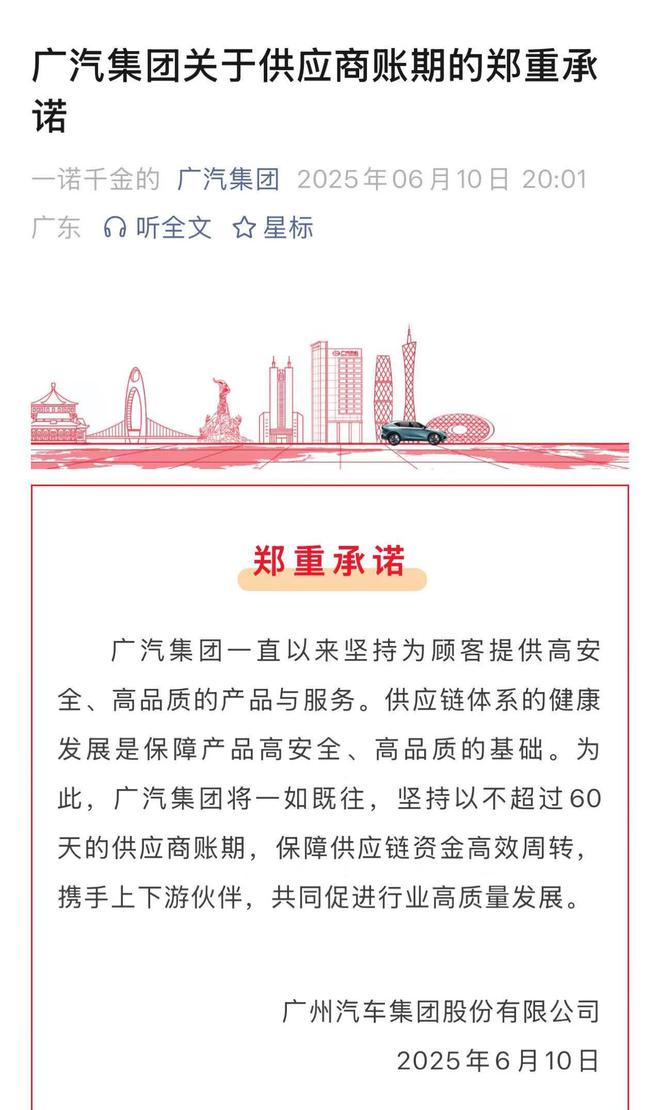 为此,广汽集团将一如既往,坚持以不超过60天的供应商账期,保障供应链资金高效周转,携手上下游伙伴,共同促进行业高质量发展。