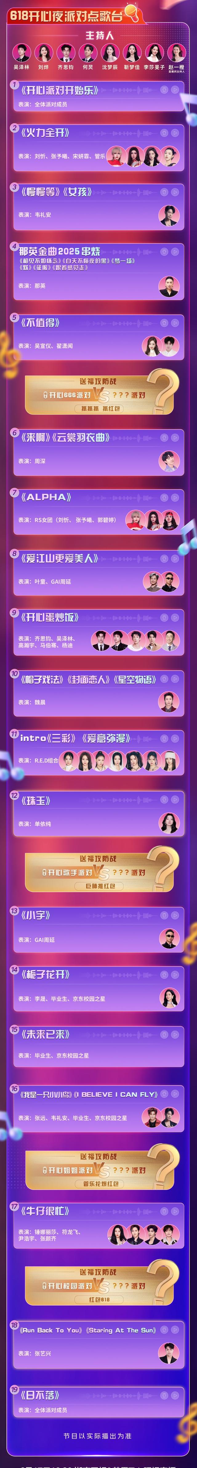 据介绍,这次晚会将打破传统舞台界限,创新推出“四大主题派对”——“开心歌手派对”、“开心姐姐派对”、“开心666派对”、“开心校园派对”。派对分别由大张伟、李晟、杨迪、张远四位“派对筹备官”领衔,横跨等多个芒果王牌IP,囊括唱跳实力、喜剧基因与青春情怀的热门嘉宾,一起嗨唱嗨玩派送福利,狂欢热浪开启一场四重开心模式的沉浸式欢乐视听盛宴。在晚会现场,四位“派对筹备官”将带领自己的艺人好友们,一起嗨唱互动,并争取赢得游戏的胜利。面对挑战,“派对筹备官”们早已蓄势待发。李晟更在晚会筹备期间更新微博,邀请网友“一起来湖南卫视618开心夜释放热情,和派对筹备官一起闪闪发光”。节目主创介绍,这四大派对的活力、情怀、欢笑与励志,将带领观众沉浸式体验不同维度的开心风暴,“这份‘开心’不只是狂欢,更是对生活的热爱提案,是给努力的自己犒赏,是用小仪式感点亮平凡日子,让生活更有滋有味、奔赴美好”。