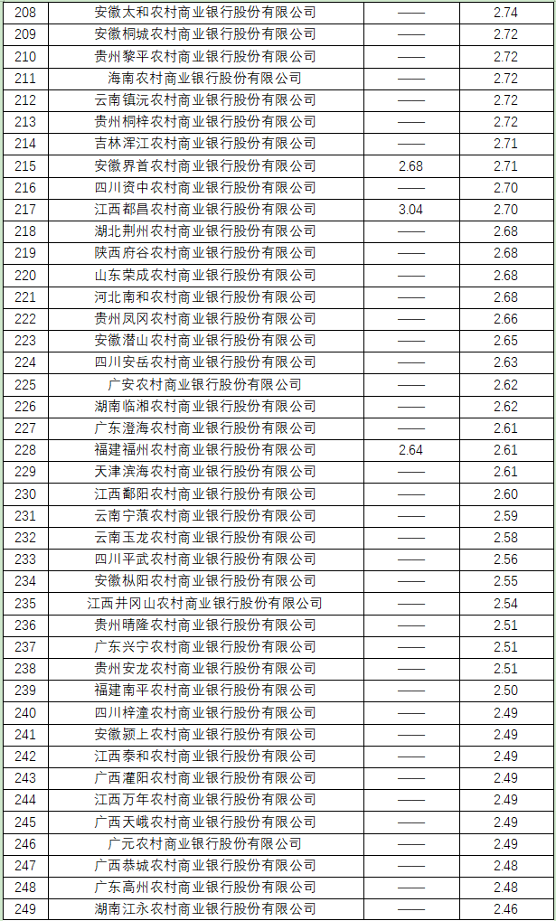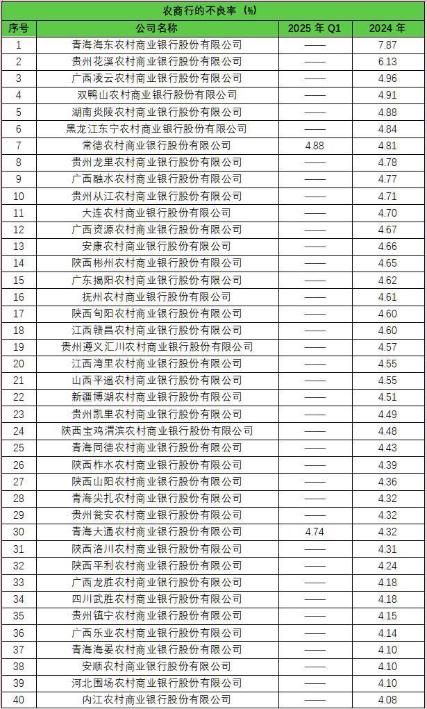 2024年农商行不良率超过3%的有155家。从2025年第一季度能查询到的不多的数据中,农商行不良率超过3%的也有10家。
