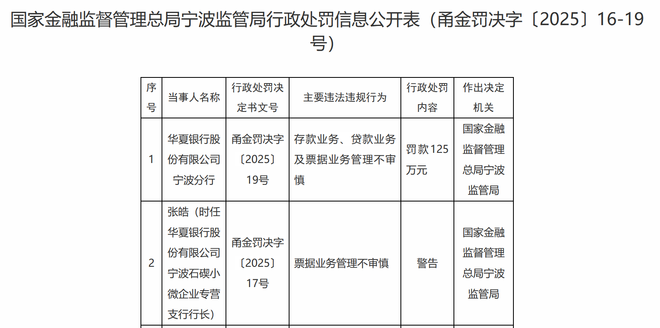 3月,华夏银行宁波分行因存贷及票据业务管理不审慎等原因,被处以125万元罚款,相关责任人被警告。