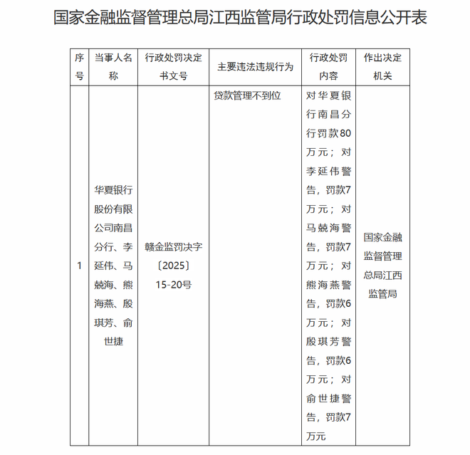 4月18日,华夏银行南昌分行因贷款管理不到位等违法违规行为,被处以80万元罚款,多位责任人被警告、罚款。