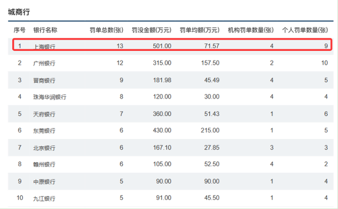 根据企业预警通发布的数据,2025年第一季度,城商行共计收到109张罚单。其中,上海银行高居榜首,机构和个人罚单总数最高,达到13张,被罚没金额超过500万元。