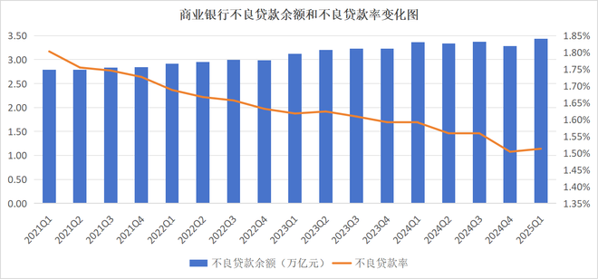 国家金融监督管理总局发布的数据显示,截至2025年一季度末,商业银行不良贷款余额增至3.43万亿元,较2024年末增加1574亿元,不良贷款率升至1.51%,环比微增0.01个百分点。