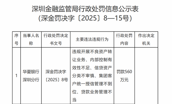 1月,华夏银行深圳分行因存在违规开展不良资产转让业务等,被处以560万元罚款,多位责任人被警告、罚款。