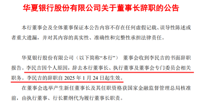 此外,华夏银行还经历了高层人事的大变动。1月24日,原董事长李民吉突然辞职。公司对此次辞职的表述引起市场关注,在公告中并未看到其履职以来作出的举措贡献等简介,同时也未看到表示"感谢"等措辞。