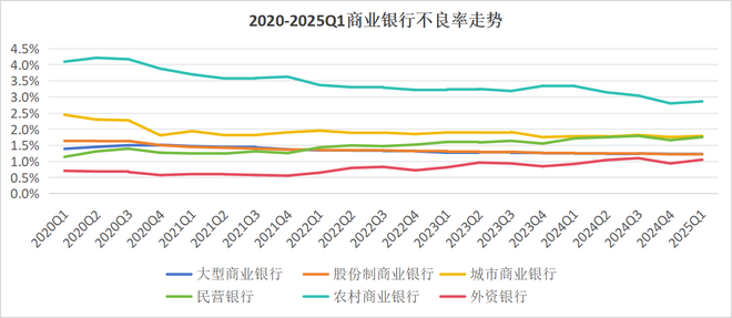 城商行需要提高警惕,其2025年一季度不良率为1.79%,环比和同比分别增0.03、0.01个百分点。
