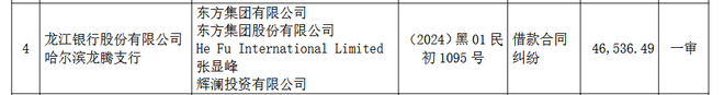 4月披露的涉诉公告显示,龙江银行一家支行向"东方系"追债4.65亿。
