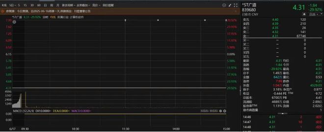 6月17日,深圳市广道数字技术股份有限公司(下称“*ST广道”)复牌,开盘“一字跌停”,收跌29.92%报4.31元/股,最新总市值为2.89亿元。