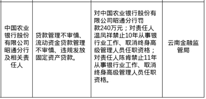 罚单显示,中国农业银行股份有限公司昭通分行的违法违规事实为:贷款管理不审慎、流动资金贷款管理不审慎、违规发放固定资产贷款。温凤祥、陈肯对以上事项负有责任。