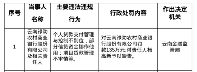罚单显示,云南禄劝农村商业银行股份有限公司的主要违法违规事实(案由)为:个人贷款支付管理与控制不到位,部分信贷资金挪作他用;项目贷款管理不审慎等。杨高新对以上事项负有责任。