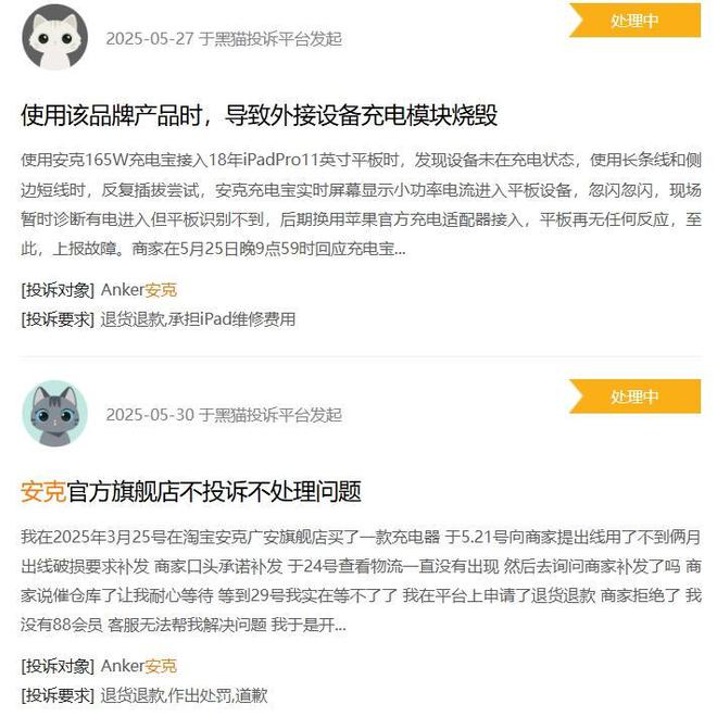 此外,在社媒平台和"黑猫投诉"平台上,也有不少消费者对安克移动电源产品的投诉,投诉内容大多涉及安克充电宝存在质量缺陷、虚假宣传、产品过热、售后服务等问题。