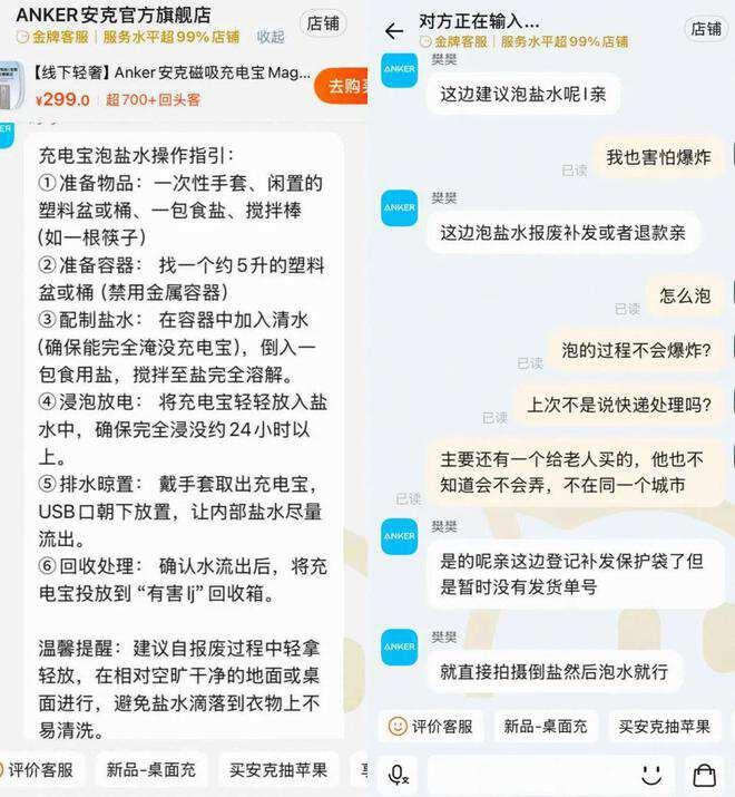 更令人诟病的是,国内消费者在申请召回过程中遭遇了极大的不透明与不便。有网友联系其淘宝客服未果,转而咨询安克官方公众号,客服竟然建议"将充电宝浸泡在盐水中24小时后报废",才可以启动退款或换货。这一做法不仅操作复杂,更缺乏安全保障,这位网友质疑道:"我怎么敢把电池泡在水里?泡的过程不会爆炸吗?"
