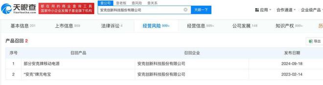 2024年6月,安克宣布召回在2023年3月后生产的安克321移动电源(型号 A1112),原因是该型号产品存在火灾隐患;同年9月,安克宣布召回2023年12月至2024年4月期间制造的多款移动电源,涉及数量为4501件。