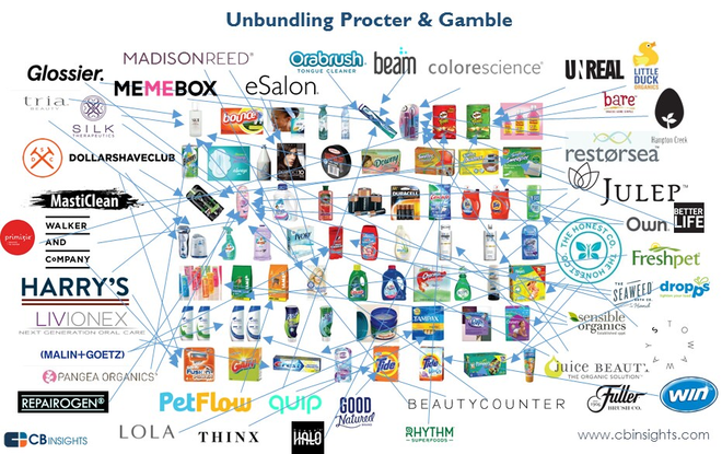 其实早在 2014 年,海外就流传着一张“海外 DTC 品牌瓜分宝洁”的现象图,也撼动了正在美国联合利华工作的我。