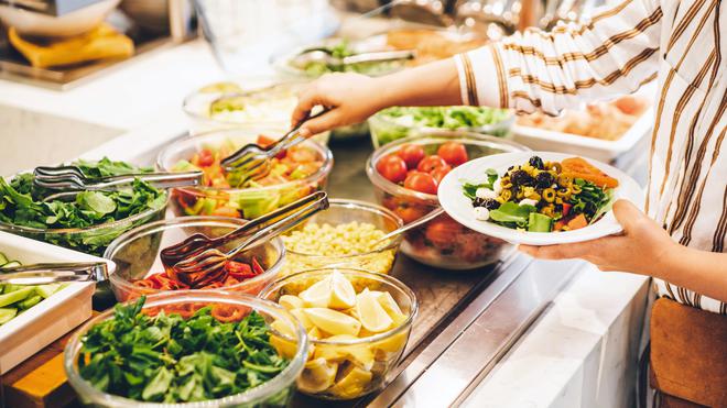 虎嗅当日到达该门店时,正逢开餐时间。工作人员将移动餐车推至该就餐区域的中心,餐车上的四个大餐盘中分别盛放着洋葱炒鸡蛋、粉条白菜炒肉、绿豆汤、馒头和小花卷。这份由一荤一素两道热菜、一个汤品、两种主食组成的午餐自助,售价12元,所有餐品无限续吃。