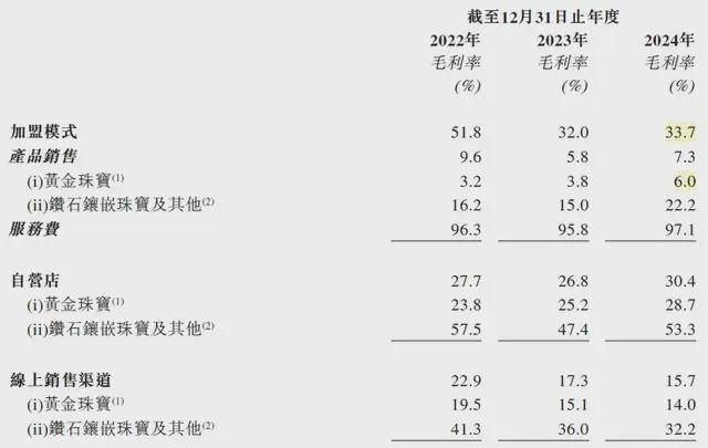 钻石镶嵌产品曾经贡献了较高的毛利,但随着市场变化,其收入占比从2022年的46.6%大幅萎缩至2024年的23.5%。