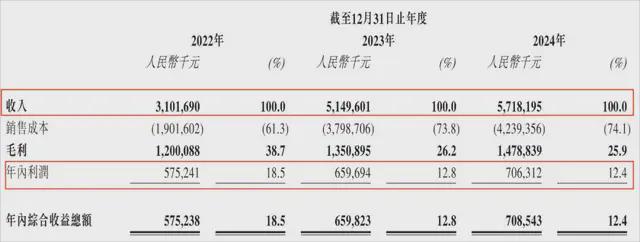 2022年至2024年,周六福展现出强劲的增长态势。营收分别为31.02亿元、51.50亿元和57.18亿元,复合年增长率高达35.8%,这一增速在全国性珠宝公司中独占鳌头,远超过同期行业平均水平的2.7%。净利润分别为5.75亿元、6.60亿元和7.06亿元,复合年增长率为10.8%。