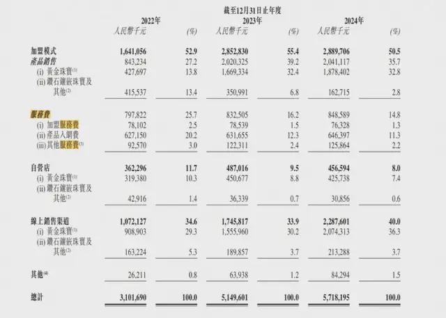 在2024年全年,其收入主要来自于加盟店产品销售、加盟店服务费、自营店产品销售和线上渠道销售,其中加盟模式收入为28.9亿元,线上销售收入为22.9亿元,二者占总营业收入的90.5%。这表明周六福在加盟模式和线上渠道的拓展上成效显著。