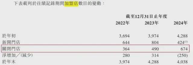2024年品牌新开424家加盟店的同时,674家门店被迫关闭,净减少250家创下历史最大跌幅。加盟商毛利率从9.6%骤降至5.8%,生存空间被极致压缩。