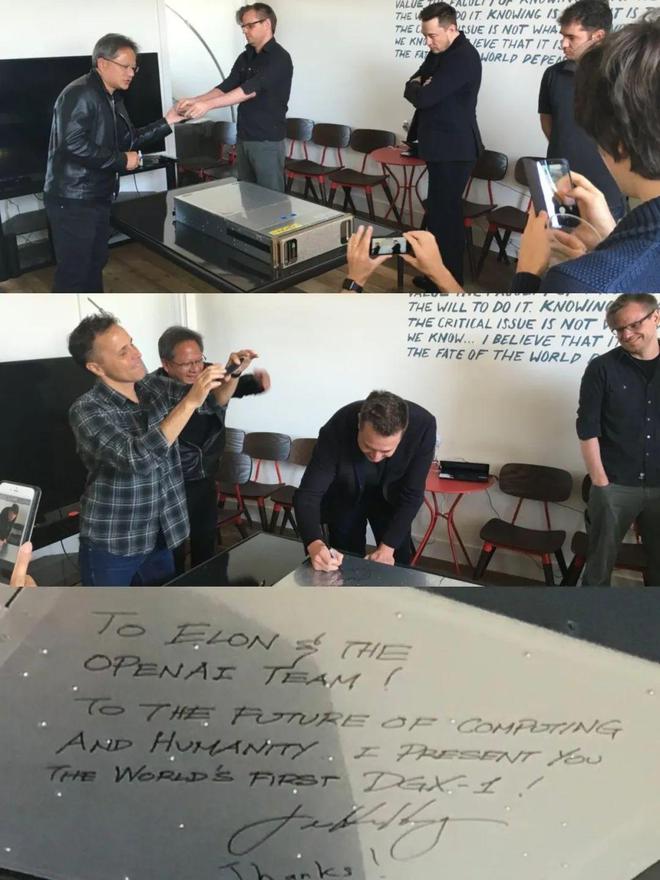 9年前,黄仁勋第一次向OpenAI赠送全球第一台DGX-1超级计算机的时候,留言"To ELON &THE OPENAI TEAM!",丝毫未提及奥特曼的名字。在那场大佬会面留下的照片资料里,也不见奥特曼的身影。