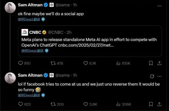 今年2月28日,CNBC报道称,Meta旗下的AI助手Meta AI即将成为该社交媒体公司的独立应用,目标直指OpenAI和谷歌母公司Alphabet等竞争对手。对此,OpenAI奥特曼回应道:"要不我们去做一款社交APP?"并在社交媒体的评论区写道,"如果Facebook想找我们麻烦,我们直接‘反杀’他们,那场面一定超搞笑。"