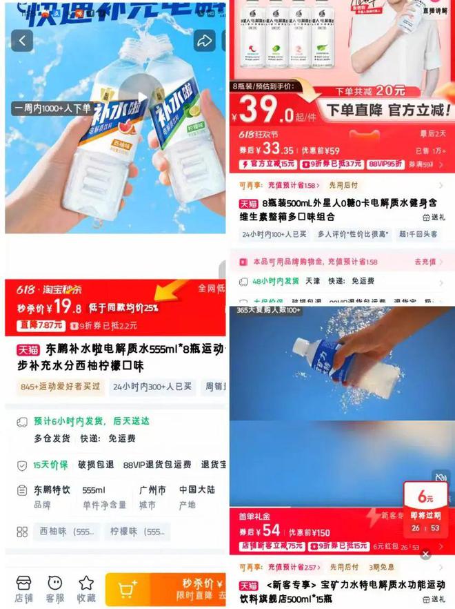 以天猫旗舰店为例,6月19日,补水啦555ml*8瓶装秒杀价19.8元,平均每瓶不到2.5元,1L*4瓶装券后20.61元,均价5.15元;外星人500ml*8瓶装券后33.35元,平均每瓶4.17元;宝矿力水特500ml*15瓶装券后54元,平均每瓶3.6元。