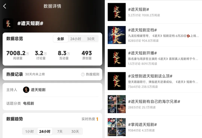 微博平台上,遮天短剧相关话题讨论量也突破九千万。