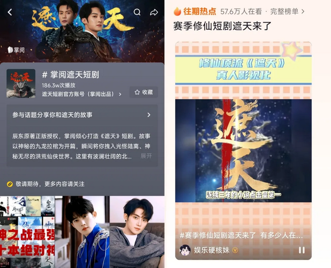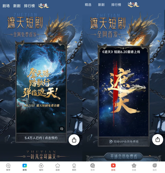 在掌阅旗下的现映APP与速看短剧APP中,也设置了《遮天》专栏,预约人数达5.4万人。