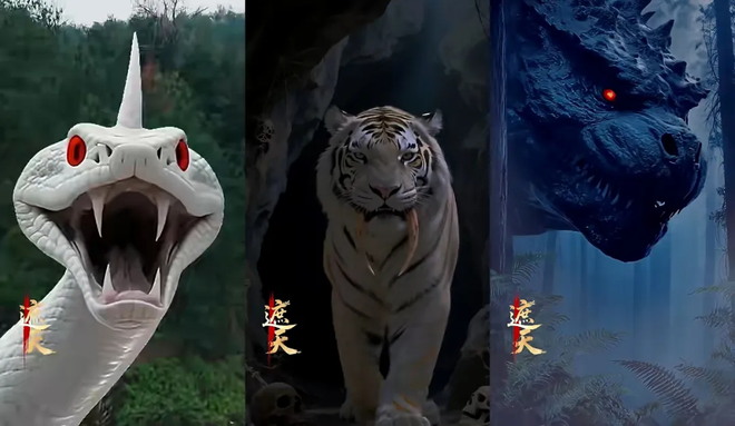 AI也为剧中的妖兽进行了还原处理,妖兽形态逼真,且融合在实景之中。猛兽战斗状态下的动作特效也没有暴露AI短板,效果表现突出。