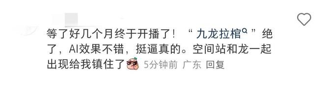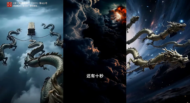 成片中呈现的"九龙拉棺"AI效果最为突出。原著中对"九龙拉棺"的描述是,"每具龙尸都长达百米,犹如铁水浇铸而成。""九具龙尸皆是五爪黑龙,除却龙角晶莹剔透、紫光闪闪外,龙身通体呈黑色,乌光烁烁。"剧中的"九龙拉棺"场面还原度较高,AI准确呈现了空间站与宇宙间的名场面。