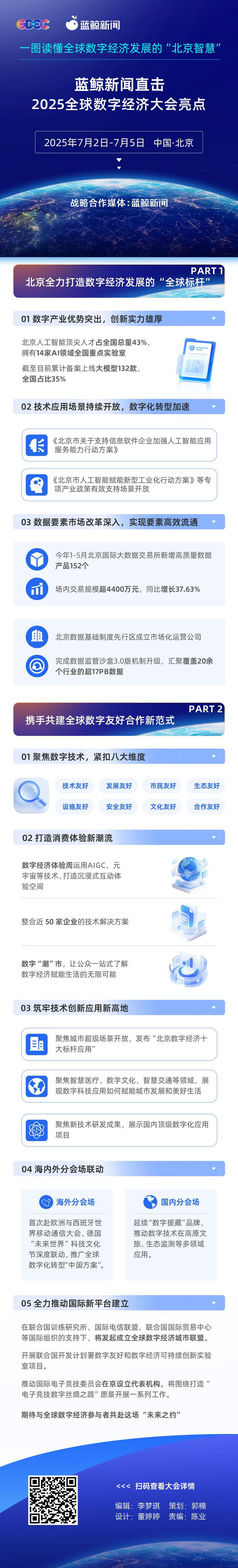 蓝鲸新闻受邀为此次大会战略合作媒体,并梳理了2025全球数字经济大会的亮点,一图呈现全球数字经济发展的"北京智慧":