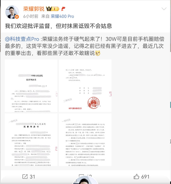 荣耀终端股份有限公司品牌营销总裁郭锐对此表示,公司欢迎公众的批评和监督,但对于恶意抹黑和诋毁的行为将不会容忍。根据法院的一审判决,被告需删除侵权内容,并在其多个社交媒体账号上发布致歉声明,同时赔偿荣耀终端有限公司30万元。被告不服判决提起上诉,但二审法院维持了原判。此事件凸显了网络言论自由的边界,以及企业维护自身声誉和合法权益的决心。