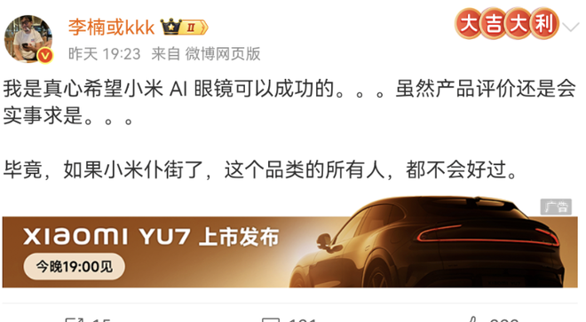 李楠希望小米AI眼镜能够取得成功,否则整个行业都会受到影响。