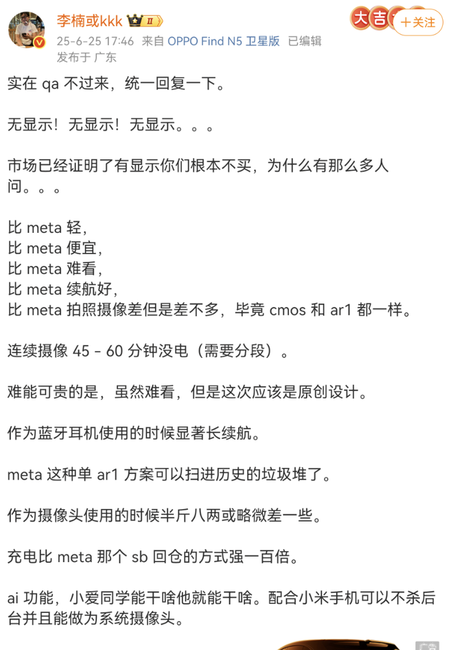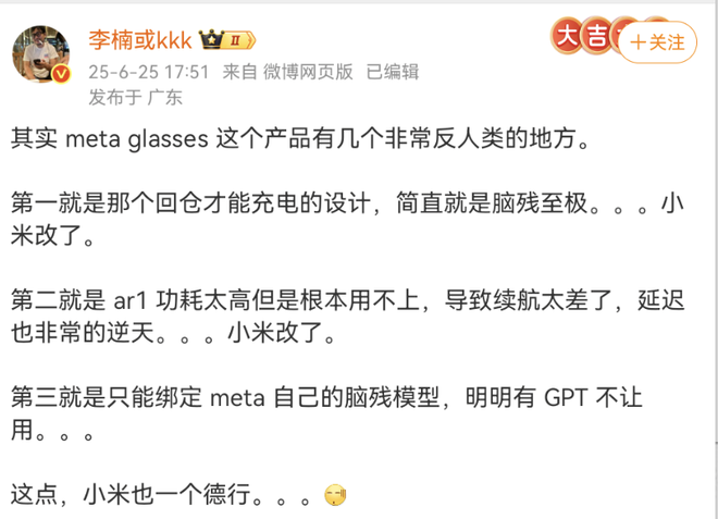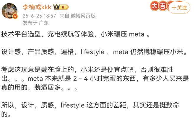 6月25日,魅族前高管、怒喵科技创始人李楠在微博上接连发布多条博文,分享了他对小米即将发布AI眼镜的详细看法。李楠认为小米AI眼镜在技术平台、充电续航等体验上碾压Meta,但设计感、产品质感、逼格和生活方式方面,Meta仍然稳稳碾压小米。