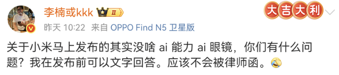 此外,李楠还吐槽小米AI眼镜“没啥AI能力”,其AI功能主要依赖小爱同学,配合小米手机可实现更多功能,但整体AI能力有限。